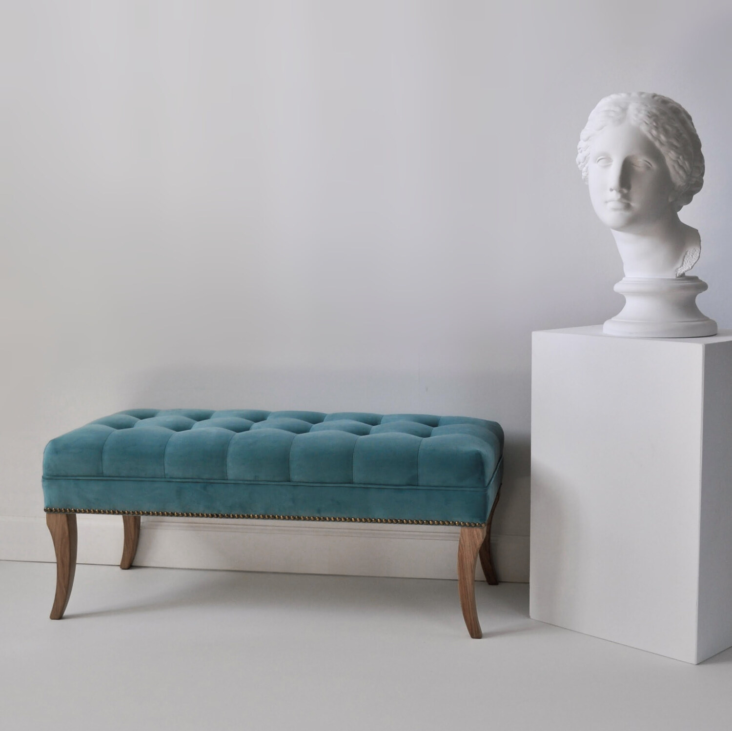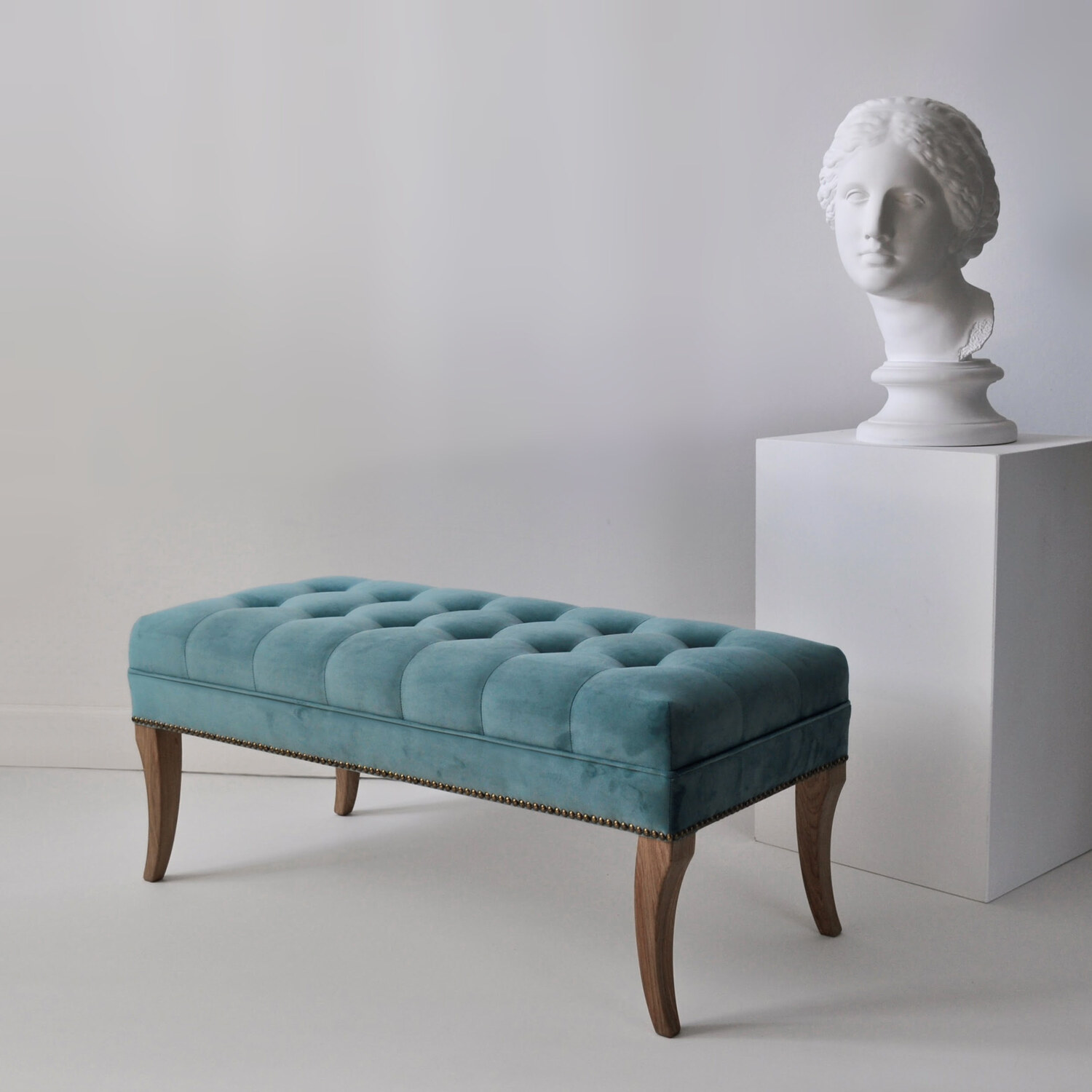 | Банкетка Blanche с элегантной стяжкой, украшенная по периметру гвоздиками и изящно изогнутыми опорами, станет изысканным элементом прихожей, гардеробной, гостиной или изножья кровати. |